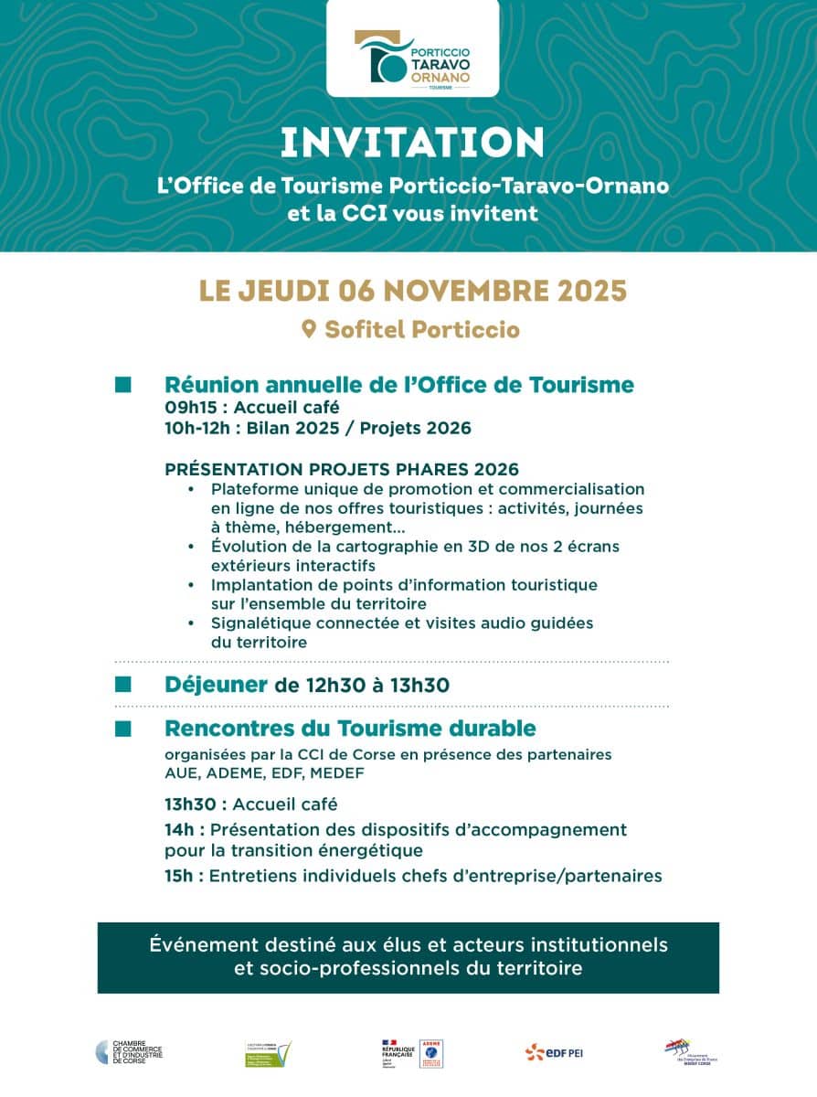 Notre Office de Tourisme et la Chambre de Commerce et d’Industrie de Corse vous invitent le jeudi 6 novembre au Sofitel à Porticcio. L’événement s’adresse aux élus ainsi qu’aux acteurs institutionnels et socio-professionnels du territoire.