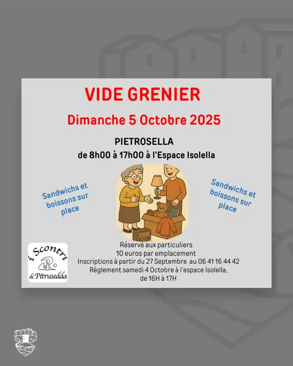 L’association i Scontri di Pitrusedda organise un vide-grenier le dimanche 5 octobre 2025, de 8h00 à 17h00, à l’Espace Isolella.